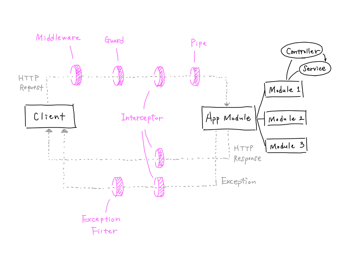 Gom tất cả các thành phần đã kể trên lại, chúng ta có thể phác hoạ ra mô hình tổng quan của một ứng dụng sử dụng NestJS như sau: